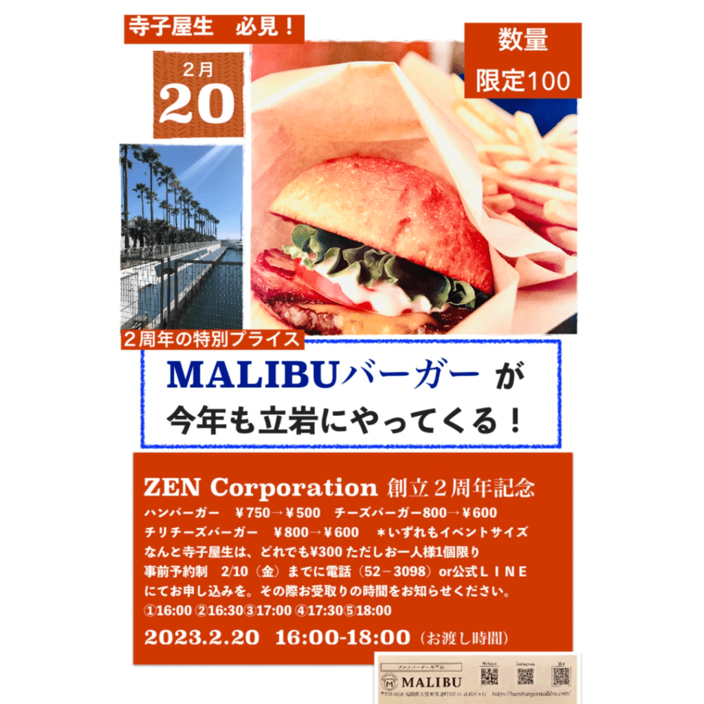 昨年も来ていただきましたグルメバーガー専門店 MALIBU(マリブ)のハンバーガーが立岩にやってきます❣️
